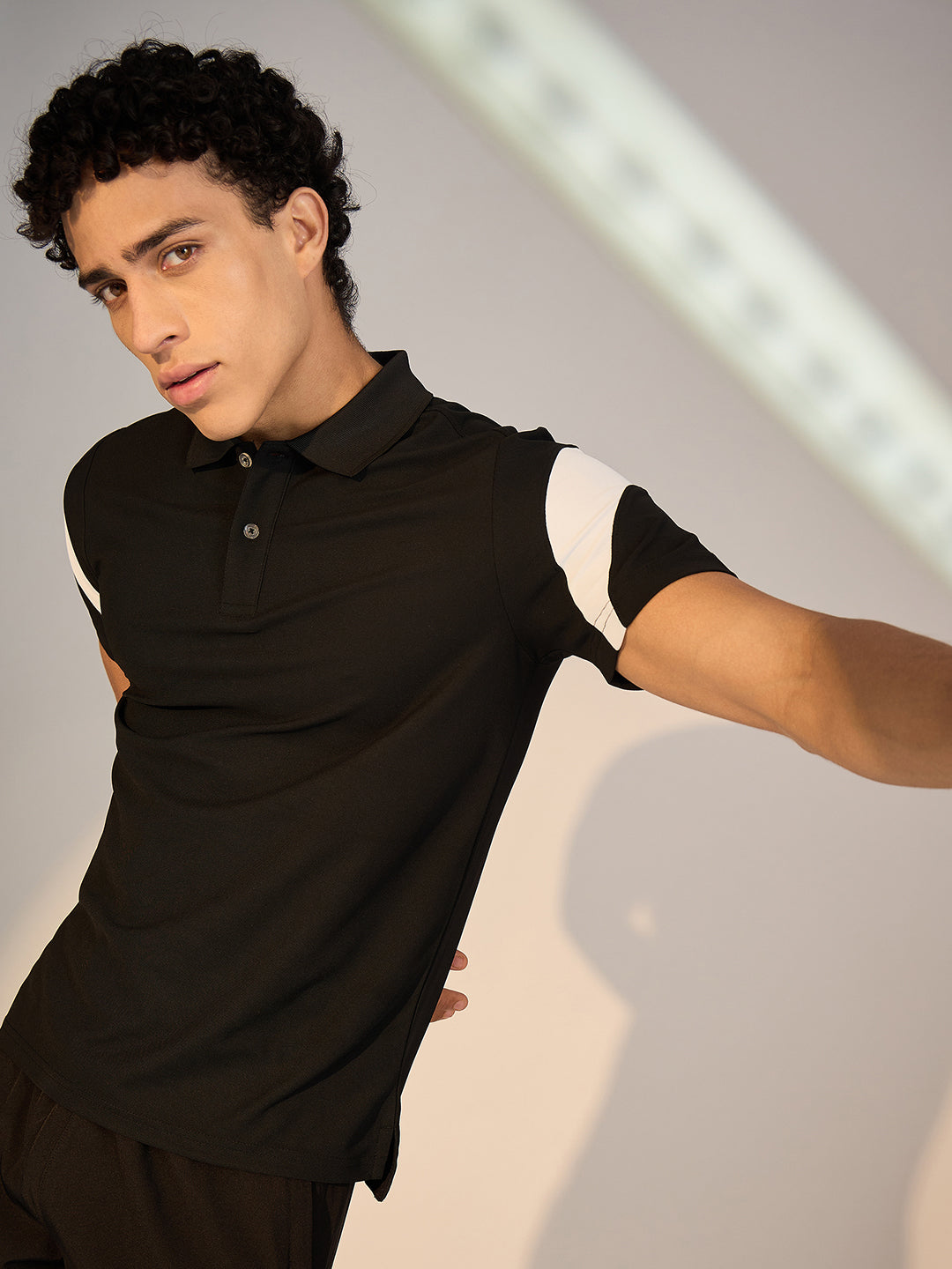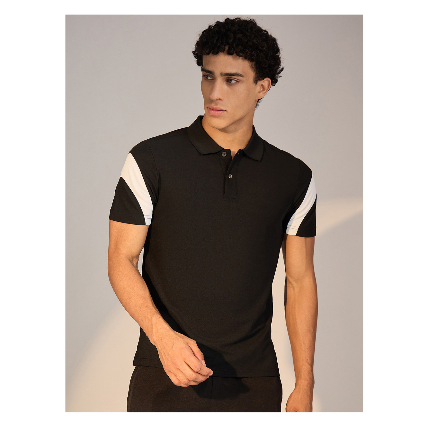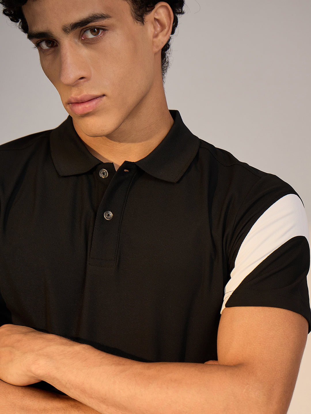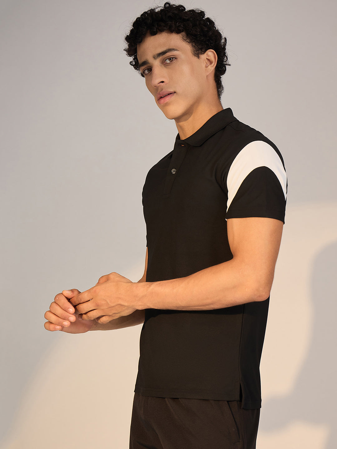 Redefine your athleisure essentials with this Polo in Black. Crafted in soft Honey Comb, it showcases regular fit, colorblocking in sleeve that enhances both comfort and style.