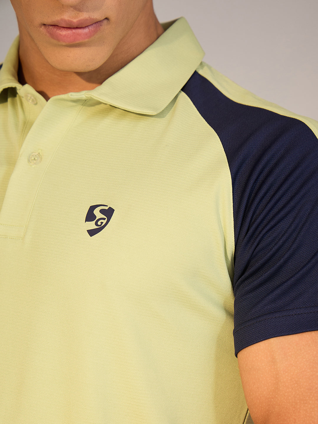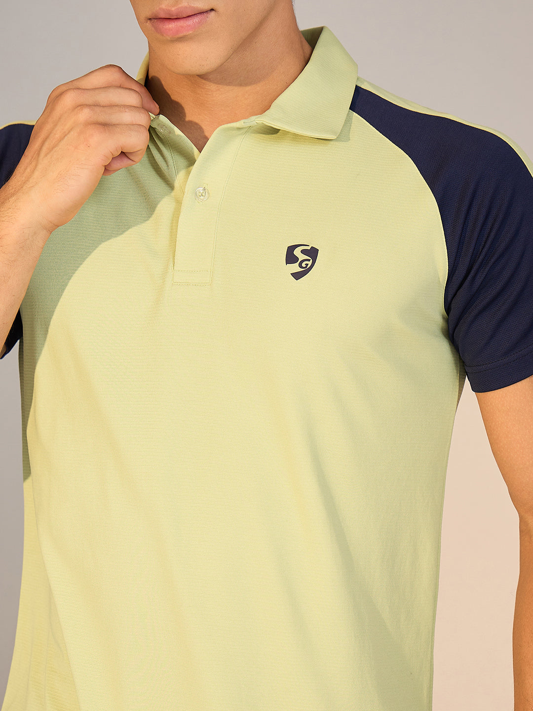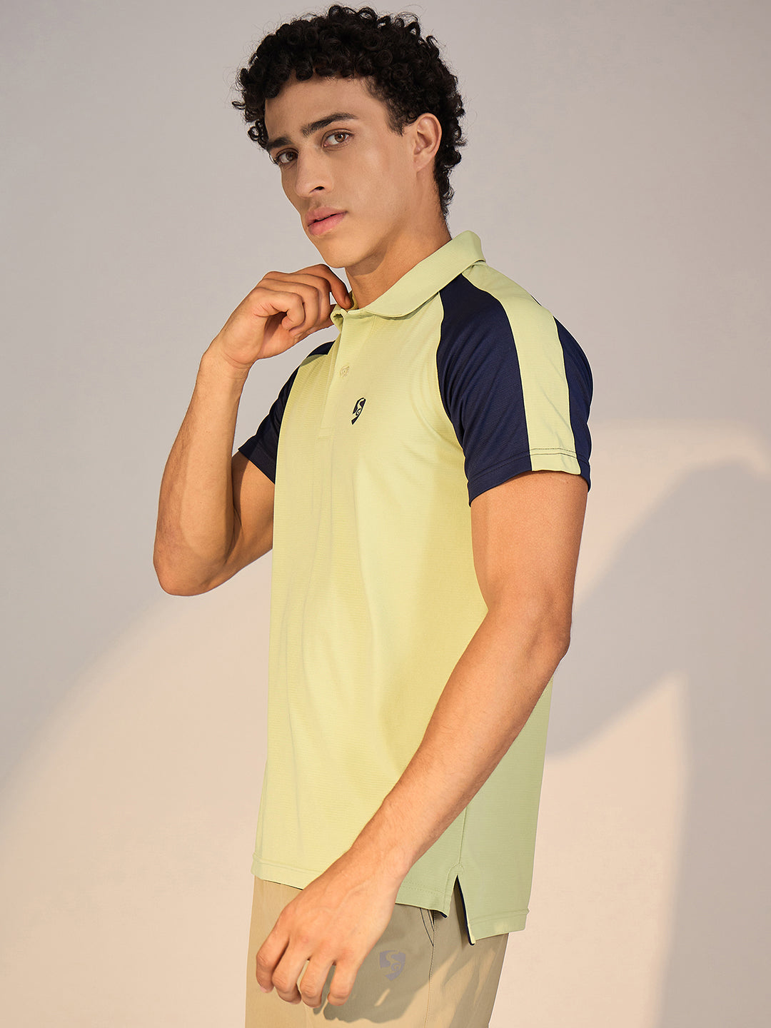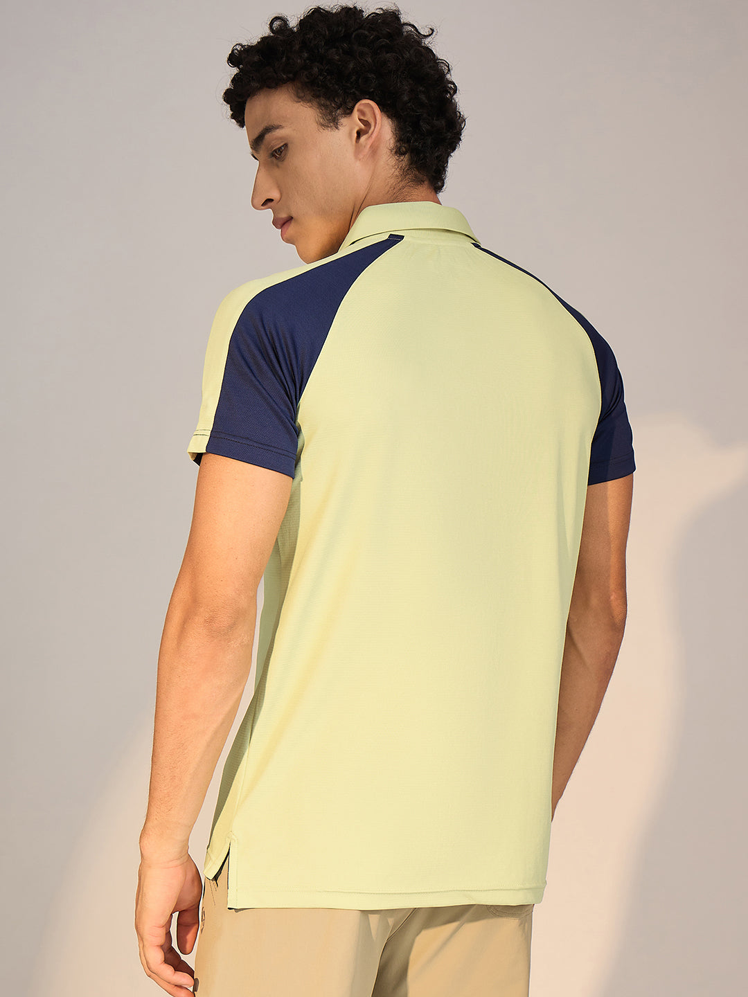 This Apple green Polo adds a dynamic edge to your men wardrobe. Made from Line Interlock, it stands out with regular fit, raglan sleeve, cut and sew panel in sleeve colorblocking style.