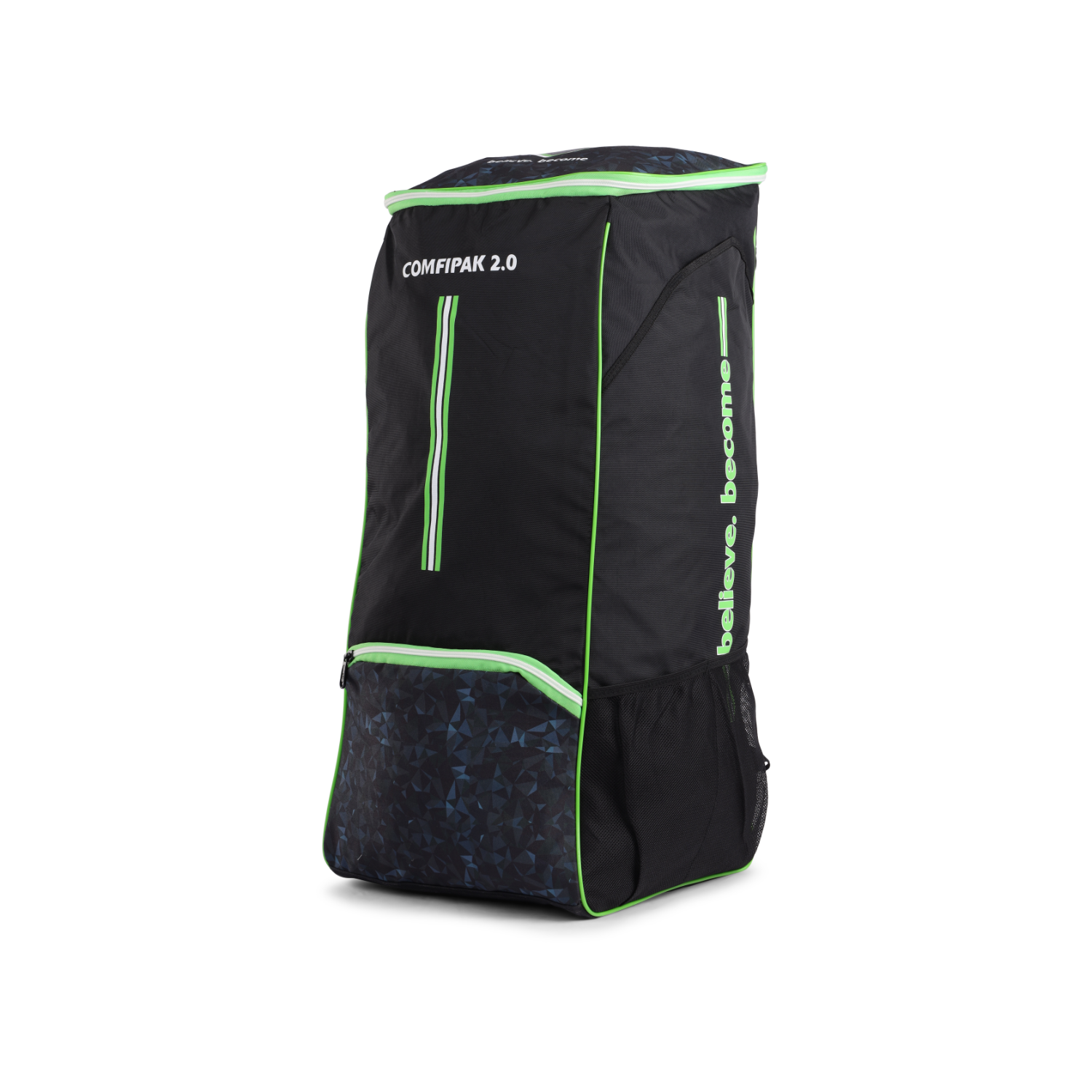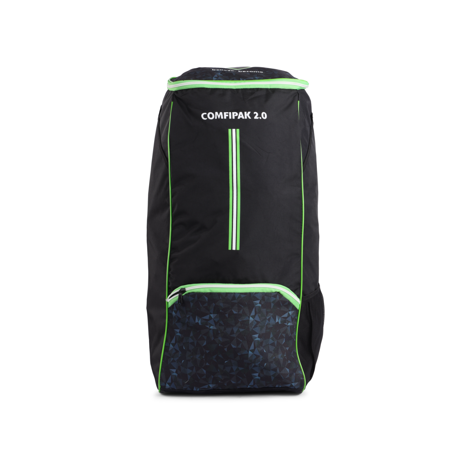 The SG Comfipak 2.0 is the perfect duffle bag for cricketers looking for a reliable, spacious, and easy-to-carry solution to store all their gear. Made from water-resistant, premium fabric, this bag offers excellent durability and protection for your cricket equipment. It features SG customized durable zips and runners for smooth functionality, and two bat-size outside storage sleeves for easy access to your bats. The easy top access to the main compartment ensures quick packing and unpacking. With 10 mm mesh-padded shoulder straps and back padding for added comfort, the bag is designed for long-lasting comfort during transport. Additionally, a front pocket provides extra storage, while the mesh pocket allows for convenient water bottle or umbrella storage.