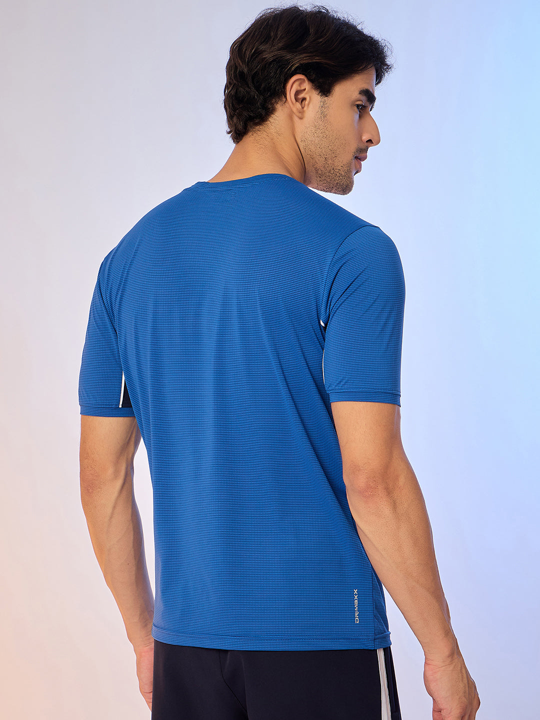 This Cobalt Blue T-shirt adds a dynamic edge to your wardrobe. Made from Poly Lycra, it stands out with regular fit, cut and sew in sleeve with contrast piping detail.